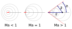 حيث M هي عدد ماخ للطائرة. So the faster it goes, the finer, (more pointed) the cone.