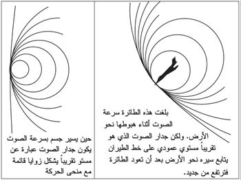 تجدر الإشارة إلى أن المخروط الذي تتوضَّع عليه موجة الصدم يؤول إلى مستوٍ عندما تبلغ سرعةُ الطائرة سرعة الصوت في الهواء تماماً، ويشكِّل المستوي عندها جداراً عند مقدِّمة الطائرة يدعى جدار الصوت يتقدم بتقدم الطائرة، ويحدث في موضع تلاقيه مع سطح الأرض أزيزاً صوتياً كالأزيز الذي يولِّده مخروط موجة الصدم، ويسود عندها هدوء أمام هذا الجدار فلا يَسمع صوت الطائرة مَن كان واقفاً أمامه.[3]