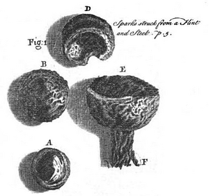Robert Hooke studied the sparks created by striking a piece of flint and steel together. He found that the sparks were usually particles of the steel that had become red hot and so melted into globules.[8] These sparks can be used to ignite tinder and so start a fire.[9]