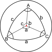 • Sides are also expressed in radians. A side (regarded as a great circle arc) is measured by the angle that it subtends at the centre. On the unit sphere, this radian measure is numerically equal to the arc length. By convention, the sides of proper spherical triangles are less than π, so that 0 < a + b + c < 2π (Todhunter,[1] Art.22,32).