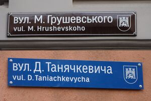 Examples of Lviv street plates written in Cyrillic and governmental standard of latinisation (2012). The upper plate-type above is found in the city centre and the lower one elsewhere.