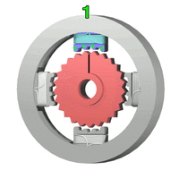 الحالة 4: يُنشَّط المغناطيس الكهربائي الأيسر (4)، مما يؤدي إلى دوران الدوار مرة أخرى بزاوية 3.6 درجة. عندما يتم تنشيط المغناطيس الكهربائي العلوي (1) مرة أخرى، سيكون الدوار قد دار بمقدار موضع الأسنان الواحد؛ نظراً لأن هناك 25 سناً، فسيستغرق 100 خطوة لإجراء دوران كامل في هذا المثال.