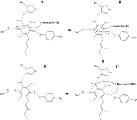 The O1 carbonyl oxygen of ubiquinone is oriented at the active site (image 4) by hydrogen bond interactions with Tyr83 of subunit D. The presence of electrons in the [3Fe-4S] iron sulphur cluster induces the movement of ubiquinone into a second orientation. This facilitates a second hydrogen bond interaction between the O4 carbonyl group of ubiquinone and Ser27 of subunit C. Following the first single electron reduction step, a semiquinone radical species is formed. The second electron arrives from the [3Fe-4S] cluster to provide full reduction of the ubiquinone to ubiquinol. This mechanism of the ubiquinone reduction is shown in image 8.