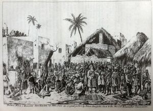 It has been estimated that between 1450 and 1900 CE as many as 17 million people were sold into slavery from Europe, Africa, and Asia and transported by Asian slave traders through the Mediterranean Sea, Silk Road, Indian Ocean, Red Sea, and Sahara desert to distant locations. As many as 5 million of these may have come from Africa, though most would have been from West Africa, rather than East Africa.[24] Before the 18th Century, the slave trade on the Southeast African coast was fairly minor. Women and children were preferred since the main roles of enslaved persons in the Asian World were as domestic servants and concubines. Most of the enslaved would have been absorbed into Swahili households. The children of enslaved concubines were born as free members of their father's lineage without distinction and manumissions were a common act of piety for elderly Muslims.[25][26] A series of slave uprisings took place between 869 and 883 CE in Basra, a city of present-day Iraq, referred to as the Zanj Rebellion. The enslaved Zanj were likely transported from the more southern areas of Southeast Africa.[27] The uprising grew to more than 500,000 slaves and free men as well, who were used in strenuous agriculture labor.[28] The Zanj Rebellion was a guerilla war mounted by slaves against the Abbasids. This revolt lasted 14 years. Slaves with numbers as high as 15,000 would raid towns, set slaves free, and seize weapons and food. These revolts greatly destabilized the grip that the Abbasids had over slaves. During the Rebellion, the slaves, under the leadership of Ali ibn Muhammad, captured Basra and even threatened to raid the capital, Baghdad.[11] The vast majority of the slave rebels were Black Africans, and the 9th century Zanj revolts in Iraq is some of the best evidence of a large number of people being sold into slavery from Southeastern Africa. As a result of this uprising, Abbasid Caliphate largely abandoned the large-scale importation of slaves from Southeast Africa.[29]
