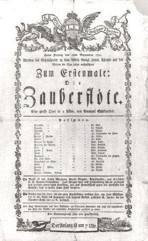 4. ^ I[mperial] & R[oyal] priv[ileged] Wieden Theater / Today, Friday 30 September 1791. / The Actors of the Imperial and Royal Privileged Theater on the Wieden will have the honor to perform / For the First Time: / DIE ZAUBERFLÖTE / A Grand Opera in 2 Acts, by Emanuel Schikaneder. / Characters / Sarastro ... Herr Gerl. / Tamino ... Herr Schack. / Speaker ... Herr Winter / {First, Second, Third} Priest ... {Her Schikaneder, sen[ior], Herr Kistler, Herr Moll} / Queen of Night ... Mme. Hofer. / Pamina, her Daughter ... Mlle. Gottlieb / {First, Second, Third} Lady ... {Mlle. Klöpfer, Mlle. Hofmann, Mme. Schack} / Papageno ... Her Schikaneder, jun[ior] / An Old Woman [i.e., Papagena]... Mme. Gerl / Monostatos, a Moor ... Herr Nouseul / {First, Second, Third} Slave ... {Herr Gieseke, Herr Frasel, Herr Starke} / Priests, Slaves, Retinue / The music is by Herr Wolfgang Amade Mozart, Kapellmeister, an actual I[mperial] and R[oyal] Chamber Composer. Herr Mozard, out of respect for a gracious and honourable public, and from friendship for the author of this piece, will today direct the orchestra in person. / The book of the opera, furnished with two copper-plates, on which is engraved Herr Schikaneder in the costume he wears for the role of Papageno, may be had at the box office for 30 kr[eutzer]. / Herr Gayl, theater painter, and Herr Nesslthaler as designer, flatter themselves that they have worked with the utmost artistic zeal according to the prescribed plan of the piece. / Prices of admission are as usual. To begin at 7 o' clock. (English translation from Deutsch (1965, 407–408))