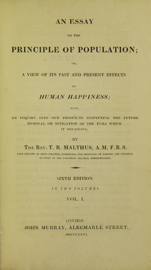 4. ^ Malthus, Thomas Robert. An Essay on the Principle of Population. Oxfordshire, England: Oxford World's Classics. p. 13. ISBN 978-1450535540.