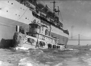 Panamanian tugboat outfitted with lines and ropes used when helping maneuver ships