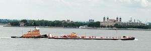 Tugboat Bill Berry of the Ingram Barge Company pushing cargo barges up the Mississippi River at Dubuque, Iowa
