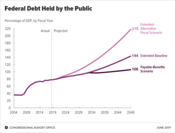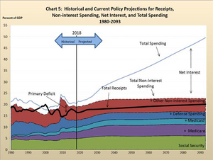 حسب مكتب الميزانية بالكونگرس، سيؤدي هذا إلى تضاعف معدلات الدين إلى ن.م.إ. بحلول عام 2040 وتضاعفها مرة أخرى بحلول 2060، لتصل إلى 600% بحلول 2080.[69] تشير محاكاة مكتب الميزانية بالكونگرس إلى أن نفقات الضمان الاجتماعي والرعاية الصحية والرعاية الطبية وحدها ستتجاوز 20% من الناتج المحلي الإجمالي بحلول عام 2080، وهي تقريباً النسبة التاريخية للضرائب التي تم جمعها من قبل الحكومة الفدرالية. وبعبارة أخرى، ستستهلك هذه البرامج الإلزامية وحدها جميع الإيرادات الحكومية بموجب هذه المحاكاة.[68]