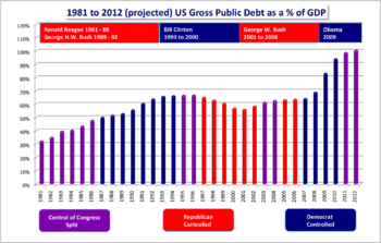 يعتبر الناتج المحلي الإجمالي مقياسا لإجمالي الحجم والإنتاج الاقتصادي. وأحد مقاييس عبء الدين هو حجمه النسبي إلى الناتج المحلي الإجمالي. في السنة المالية 2007، وصل الدين العام الأمريكي إلى. 5 تريليون دولار (36.8% من الناتج المحلي الإجمالي) وكان إجمالي الدين العام $9 تريليون (65.5 % من الناتج المحلي الإجمالي.)[43] ويمثل الدين العام الأموال المستحقة لحملة الأوراق الحكومية مثل أذون الخزانة والسندات. يشمل إجمالي الدين؛ الديون الحكومية الداخلية، والتي تتضمن مبالغ مستحقة لصناديق إئتمان الأمن الضمان الاجتماعي (حوالي 2.2 تريليون دولار في السنة المالية 2007)[44] وصناديق تقاعد الخدمة المدنية. بحلول أغسطس 2008، كان إجمالي الدين 9.6 تريليون دولار.[45]