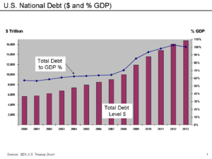 حسب ميزانية الولايات المتحدة لعام 2010، فقد قارب إجمالي الدين القومي لضعف ما كان عليه في 2008 حسب القيمة الإسمية للدولار، وسوف ينمو لحوالي 100% من الناتج المجلي الإجمالي في 2015، في مقابل ما يقرب من نسبة 80% في أوائل عام 2009.[46] صرحت مصادر حكومية متعددة بما في ذلك الرؤساء الحاليين والسابقين، مكتب محاسبة الحكومة، وزارة الخزانة، ومكتب الميزانية بالكونگرس أن الولايات المتحدة في مسار مالي غير مستدام[47] وإن زيادة نسبة الدين، قد تؤدي لإنهيار قيمة الدولار. وتسديد الديون في حالة إنخفاض سعر العملة يمكن أن يؤدي لالمستثمرون (بما فيهم الحكومات الأخرى) إلى المطالبة برفع سعر الفائدة في حالة توقعها إستمرار إنخفاض سعر الدولار. ودفع معدلات فائدة عالية قد يؤدي إلى بطء النمو في الولايات المتحدة.