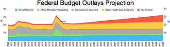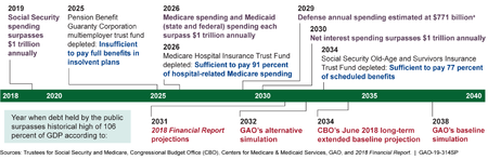 تتسبب التحولات الديموغرافية والإنفاق للفرد في زيادة نفقات الضمان الاجتماعي والرعاية الصحية/الرعاية الطبية بشكل أسرع من الناتج المحلي الإجمالي. إذا استمر هذا الاتجاه، فإن المحاكاة الحكومية في ظل افتراضات مختلفة تتوقع الإنفاق الإلزامي لهذه البرامج ستتجاوز الضرائب المخصصة لهذه البرامج بأكثر من 40 تريليون دولار على مدى السنوات الـ 75 المقبلة على أساس القيمة الحالية.[68]