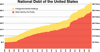 في فبراير 2024، ارتفع إجمالي الدين الحكومي الفدرالي إلى 34.4 تريليون دولار بعد أن نما بنحو تريليون دولار في فترتين منفصلتين مدتهما 100 يوم منذ يونيو السابق.[20] اعتباراً من 6 مارس 2025، بلغ الدين الحكومي الفدرالي 36.56 تريليون دولار.[21]