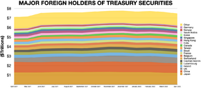 اعتباراً من أكتوبر 2018، كان الأجانب يمتلكون 6.2 تريليون دولار من ديون الولايات المتحدة، أو ما يقرب من 39% من الديون التي يحملها الجمهور والتي تبلغ 16.1 تريليون دولار و28% من إجمالي الديون البالغة 21.8 تريليون دولار.[57] في ديسمبر 2020، بلغت حصة الأجانب من الدين العام الأمريكي 33% (7 تريليون دولار من أصل 21.6 تريليون دولار)؛ ومن هذه القيمة البالغة 7 تريليون دولار، كانت حصة الحكومات الأجنبية 4.1 تريليون دولار (59.2%)، بينما كانت حصة المستثمرين الأجانب 2.8 تريليون دولار (40.8%). وبضمّ كلٍّ من حاملي الديون الخاصة والعامة، فإن أكبر ثلاثة دائنين محليين في ديسمبر 2020 هم اليابان (1.2 تريليون دولار أو 17.7%)، والصين (1.1 تريليون دولار أو 15.2%)، والمملكة المتحدة (0.4 تريليون دولار أو 6.2%).[58]