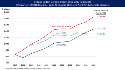 - يقدر مكتب الميزانية بالكونگرس حسب سيناريو بديل (حيث يتم الحفاظ على السياسات المعمول بها اعتباراً من أبريل 2018 بعد بدء أو انتهاء الصلاحية المقررة) أن العجز سيكون أعلى بكثير، حيث يرتفع بمقدار 13.7 تريليون دولار خلال الفترة 2018-2027، بزيادة قدرها 3.6 تريليون دولار عن توقعات خط الأساس في يونيو 2017. قد يشمل الحفاظ على السياسات الحالية على سبيل المثال تمديد التخفيضات الضريبية الفردية التي أقرها ترمپ بعد انتهاء مدتها المقررة في عام 2025، من بين تغييرات أخرى.