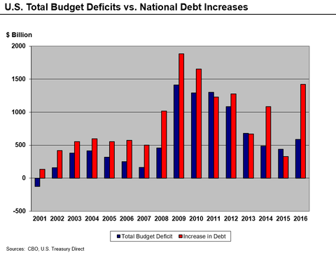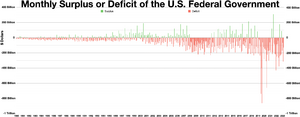 يشير الفائض أو العجز الحكومي السنوي إلى الفرق النقدي بين المبالغ المحصلة والمنفقة من قبل الحكومة مع تجاهل التحويلات الحكومية الداخلية. يزيد أو ينخفض اجمالي الدين العام كنتيجة لفائض أو عجز الميزانية الموحدة. ومع ذلك، فإن هناك بعض الإنفاق (اعتمادات كلية) تضاف إلى إجمالي الدين لكن يتم استبعادها من العجز. زاد إجمالي الديون عن $500 بليون لكل سنة منذ سنة 2003، ثم بزيادة 1 ترليون في سنة 2008، ثم 1.9 تريليون في سنة 2009، و1.7 تريليون دولار في 2010.[24] جنبا إلى جنب مع العجز في الميزانية، فقد كان الدين العام أحد الأسباب التي قدمتها ستاندرد أند پورز لخفض ترتيب الولايات المتحدة في توقعات الإئتمان في 18 أبريل 2011.[25]