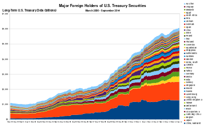 وفي سبتمبر 2014، كان أكبر دائن مفرد للحكومة الأمريكية هو الصين، بنحو 21% من كل سندات الخزانة الأمريكية التي يملكها أجانب (10% من إجمالي الدين العام الأمريكي).[59] ممتلكات الصين من الدين الحكومي، كنسبة من كل الدين الحكومي الذي يحتفظ به أجانب قد ارتفع بشكل ملحوظ منذ عام 2000 (حين كانت الصين تحتفظ بمجرد 6% من كل سندات الخزانة الأمريكية التي يحتفظ بها أجانب).[60]