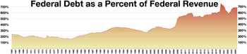 منذ أن بدأ الاقتصاد الأمريكي في النمو بعد عامين تقريبا من الحرب العالمية الثانية، ارتبط حجم الدين العام بالاقتصاد (أي كنسبة من الناتج المحلي الاجمالي) كمفتاح قياس آخر. وارتفع الناتج المحلي الاجمالي مرتبطا باجمالي الدين إلى أكثر من 100% نتيجة لنفقات الحرب العالمية الثانية ثم انخفض مرة أخرى، ليرتفع في الثمانينيات كجزء من الحرب الباردة ومرة أخرى بسبب الركود الاقتصادي والقرارات السياسية في أوائل القرن الحادي والعشرين.