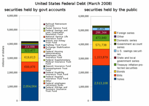 كما هو واضح من الرسم البياني، فإن أقل قليلاً من نصف إجمالي الدين القومي مستحق لـ "الاحتياطي الفيدرالي والأرصدة الحكومية". كما يتم تجميع حاملي الديون الأجانب والدوليين من أقسام الأوراق النقدية والأذونات والسندات. إلى اليمين مخطط للبيانات اعتباراً من يونيو 2008: