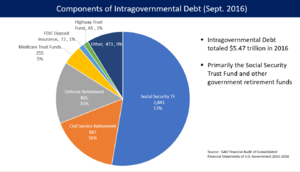 - "ديون الحسابات الحكومية" أو "الدين الحكومي" - وهو عبارة عن سندات الخزانة غير القابلة للتسويق ضمن حسابات البرامج التي تديرها الحكومة الفدرالية، مثل صندوق ائتمان الضمان الاجتماعي. تمثل الديون التي تحتفظ بها الحسابات الحكومية الفوائض التراكمية، بما في ذلك أرباح الفوائد، للبرامج الحكومية المختلفة التي تم استثمارها في سندات الخزانة.