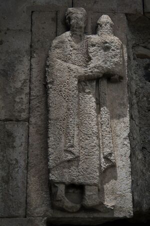 Giorgi Merchule advanced the definition of the nation based upon religious and linguistic considerations. This trend would also continue under Georgian Sabaite monk John Zosimus who would attribute divine, unique and sacred role to the Georgian language, that, as he believed, would be a tongue to be used on the Last Judgment.[20] The Georgian liturgical language was a national unifier when political and cultural unity was still very elusive.[21] Eventually, with an immense ideological support from the clerics, the Georgian unification would come from a resurgent Bagrationi family based in the Kingdom of the Iberians[22] and King George II of Abkhazia, and his policy of unifying Georgian polities by interdynastic marriages and intrigues, resulting, his daughter, princess Gurandukht marrying Gurgen, King of Kings of the Iberians, bearing Bagrat, the first all-Georgian king.[23]