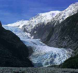 Valley glaciers are outlet glaciers that provide drainage for ice fields, icecaps or ice sheets.[15] The flow of these glaciers is confined by the walls of the valley they are found in; but they may also form in mountain ranges as gathering snow turns to ice.[4][16] The formation of valley glaciers is restricted by formations such as terminal moraines, which are collections of till (unconsolidated rock material) deposited by the terminus of the glacier. Ice-free exposed bedrock and slopes often surround valley glaciers,[17] providing a route for snow and ice to accumulate on the glacier via avalanches. Examples include: