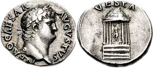 The myths depicting Vesta and her priestesses were few, and were limited to tales of miraculous impregnation by a phallus appearing in the flames of the hearth—the manifestation of the goddess.[2] Vesta was among the Dii Consentes, twelve of the most honored gods in the Roman pantheon.[3] She was the daughter of Saturn and Ops, and sister of Jupiter, Neptune, Pluto, Juno, and Ceres. Her closest Greek equivalent is Hestia.[4]