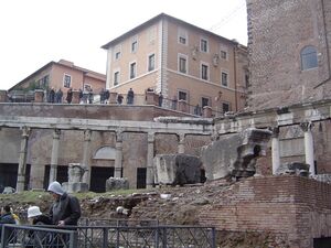 In 367, during his tenure as praefectus urbi, he oversaw the restoration of the Porticus Deorum Consentium in the Roman Forum (41°53′33.2″N 12°29′1.27″E / 41.892556°N 12.4836861°E), the last great monument devoted to a pagan cult in Rome.[10] Even if this was a simple restoration of the damaged statues and a renovation of the worship, it was a symbolic choice, as the Di Consentes were the protectors of the Senate,[17] and therefore used to balance the power of the Emperor (it is significant that the inscription does not mention the Emperor).[18] It has been also proposed that the restoration of the cult of the Di Consentes appealed to Praetextatus as a propagation of "his ideology of the numen multiplex" cited in his funerary poem.[18]