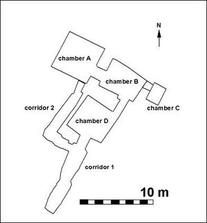 تحتوي المقبرة على ثلاث حجرات أكبر، أطلق عليها المنقبون الحروف A وB وD. الحجرة C هي حجرة أصغر، تقع بجوار الحجرة B. الحجرة A (ارتفاعها 5.3 × 5.2 و3.4 متر) هي الحجرة الأعمق والأكبر حجماً والتي كانت مزخرفة ذات يوم، لكن لم يتبق من الزخارف سوى أجزاء صغيرة، خاصة في الأركان.[8] يوجد ممران، الممر الأول هو الممر الرئيسي الذي يشكل المدخل ويؤدي إلى الغرفة D. والممر الثاني هو الممر الأخير، ويبدأ من الجانب الغربي للممر الأول ويمتد إلى الحجرة الرئيسية A حيث يدخل الحجرة على ارتفاع 1.7 متر فوق مستوى الأرض.[8]