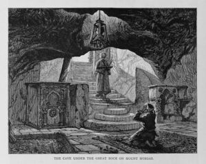 رحلة من خمس عشرة درجة تأخذنا إلى الكهف تحت هذه الصخرة. تمت الكتابة عن هذا الأمر بشكل كبير. سأكتفي بالقول إن الكابتن بيرتون يعتبرها مخزن الحبوب الأصلي لدرس الذرة، يحطيه السهل من كلا الجانبين، ومذرته من الصخرة. إذا ثبت أن الكهف هو مذبح الأضحية، فإن الكهف سيكون صهريجًا للدم الذي سرب من بئر الأرواح إلى وادي هنوم. بذل زوجي قصارى جهده لفتح اللوح ذي السبر المجوف في الوسط، لكن الوقت لم يحن بعد. يعتقد المسلمون الجهلاء أن الصخرة معلقة في الهواء، والشئ الوحيد الذي يدعمها هو نخلة، تحملها أمهات النبيين العظيمين، محمد وإبراهيم. يُطلق على النقطة الأكثر بروزًا اسم "اللسان"، لأنه عندما اعتقد عمر أنه اكتشف الحجر الذي كان عمود يعقوب في رؤيته في بيت إيل، قال: "السلام عليكم"، ورد الحجر: "عليكم السلام ورحمة الله". شرح لنا شيوخ المسجد كل شيء، حتى أدق التفاصيل، وأرونا الأماكن التي صلى فيها سليمان، وكذلك داود، والمكان الذي التقى إبراهيم وإلياس ومحمد فيه خلال رحلة الإسراء والمعراج فوق حائط البراق. وقاموا بإحداث صدى لنا، وأخبرونا أن هناك مكانًا فارغًا تحت بئر الأرواح المذكور سابقًا، حيث تأتي الأرواح الراحلة كل يوم جمعة لتعبد الله.[11]