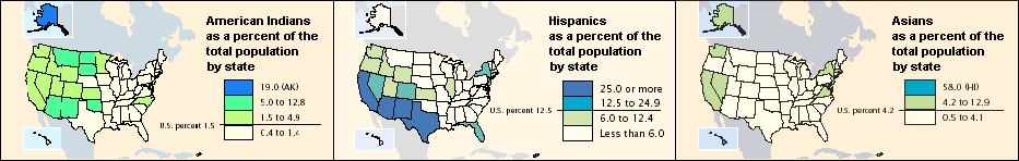 These maps from the 2000 US Census highlight differences from state to state of three minority groups. Most of the American Indian, Hispanic, and Asian population is in the West.