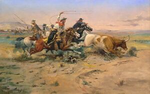 While the West is defined by many occupations, the American cowboy is often used as an icon of the region, here portrayed by C. M. Russell.