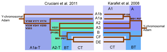 2. ^ Cruciani, Fulvio; Trombetta, Beniamino; Massaia, Andrea; Destro-Bisol, Giovanni; Sellitto, Daniele; Scozzari, Rosaria (2011). "A Revised Root for the Human Y Chromosomal Phylogenetic Tree: The Origin of Patrilineal Diversity in Africa". The American Journal of Human Genetics. 88 (6): 814. doi:10.1016/j.ajhg.2011.05.002.