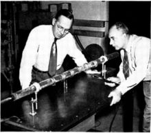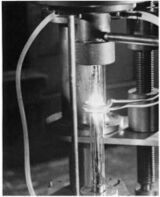 (right) Vertical zone refining, 1961. The induction heating coil melts a section of the metal bar in the tube. The coil moves slowly down the tube, moving the molten zone to the end of the bar.
