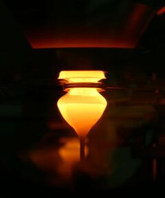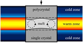 Zone melting (or zone refining, or floating-zone method, or floating-zone technique) is a group of similar methods of purifying crystals, in which a narrow region of a crystal is melted, and this molten zone is moved along the crystal. The molten region melts impure solid at its forward edge and leaves a wake of purer material solidified behind it as it moves through the ingot. The impurities concentrate in the melt, and are moved to one end of the ingot. Zone refining was invented by John Desmond Bernal[1] and further developed by William G. Pfann[2] in Bell Labs as a method to prepare high-purity materials, mainly semiconductors, for manufacturing transistors. Its first commercial use was in germanium, refined to one atom of impurity per ten billion,[3] but the process can be extended to virtually any solute–solvent system having an appreciable concentration difference between solid and liquid phases at equilibrium.[4] This process is also known as the float zone process, particularly in semiconductor materials processing.